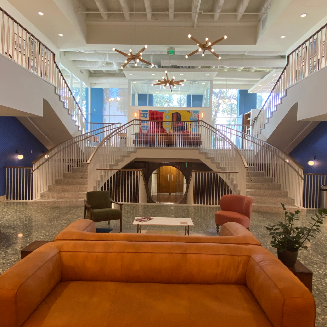 As soon as you enter the building, you’ll see a staircase on your left (pictured). Please head down the stairs. This area also serves as a comfortable waiting space for guests.