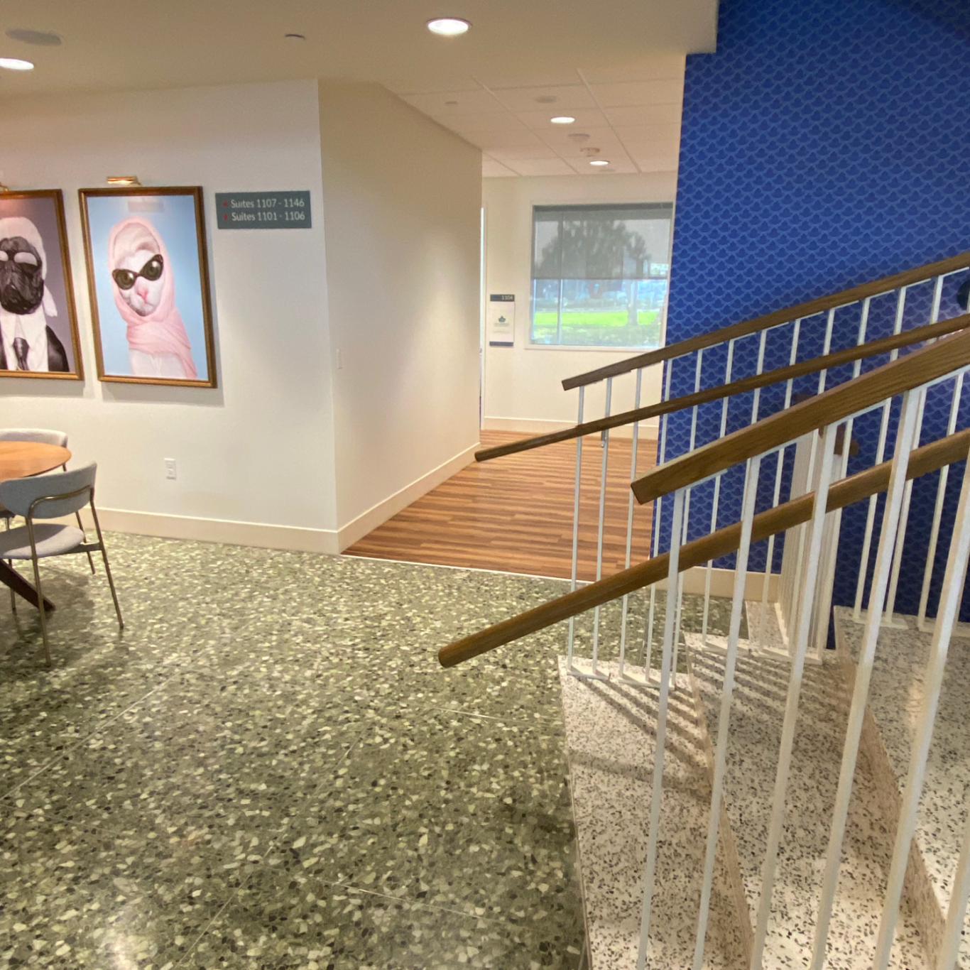 At the bottom of the stairs, take an immediate right into the hallway. Our office, Suite #1104, is just a few steps down. If I happen to be with another patient when you arrive, you’re welcome to relax on any of the couches or chairs in the main lobby area until I’m ready for you.